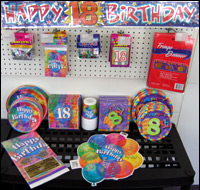 tablecovers, cups, candles, banners, balloons and "18" confetti.