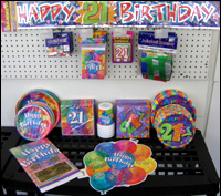 tablecovers, cups, candles, banners, balloons and "21" confetti.