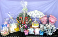 carousel umbrella, gift baskets, new dad's tool kit, candy bouquet with